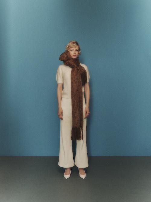 ウォーム感のある毛足の長いウールモヘアは上品な光沢が特徴で、かわいらしさの中に大人の雰囲気を感じさせるマフラーです。